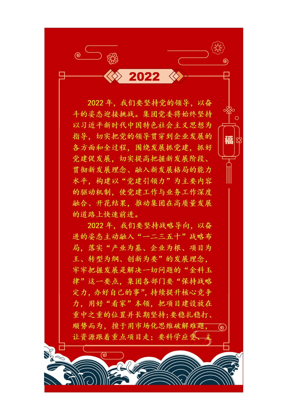 余永海強(qiáng)調(diào),2022年要重點(diǎn)落實(shí)集團(tuán)“一二三五十”工作布局?!耙弧笔峭怀霎a(chǎn)業(yè)發(fā)展這條主線,“二”是強(qiáng)化人才強(qiáng)企、創(chuàng)新發(fā)展兩大戰(zhàn)略,“三”是堅(jiān)持穩(wěn)健經(jīng)營、風(fēng)險(xiǎn)控制、效益提升三大原則,“五”是抓好“五項(xiàng)重點(diǎn)”、“十”是抓實(shí)“十大項(xiàng)目”。切實(shí)抓牢黨建引領(lǐng)、廉政護(hù)航、制度規(guī)范、系統(tǒng)賦能、安全生產(chǎn)“六個(gè)保障”,努力打造成為“功能專業(yè),業(yè)績一流,管理卓越,運(yùn)轉(zhuǎn)高效”的國有資本運(yùn)營公司,為南陽建設(shè)副中心城市做出新的更大貢獻(xiàn)。